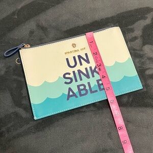 Chic Spartina 449 pouch with bold 'UNSINKABLE' text. Features a stylish wave pattern.