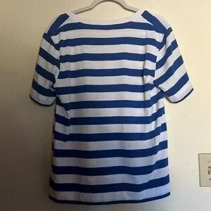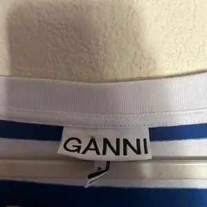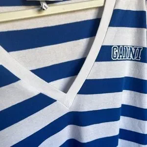 Ganni Blue and White Striped Logo Tee Shirt V Neck Size Medium