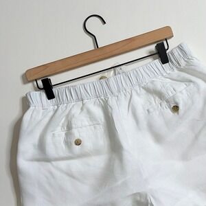 Defined waistband with belt loops … elastic/stretch across the back of the waist ~ Two buttons and a zipper closure on the front ~ Two inset pockets on the front … two inset welt pockets on the backside with button closures ~ Wide comfortable legs ~ Fully lined ~ Soft non-stretch linen fabric ~ Solid white … so versatile!!