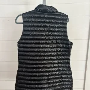 This lightweight, packable down vest features a sleek, slightly lustrous black fabric that elevates a classic layering staple. Designed with 700-fill-power goose down for warmth without bulk, it’s perfect for travel, everyday wear, and transitional seasons.