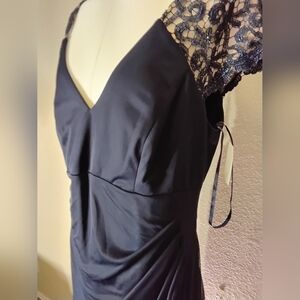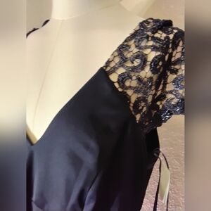 This elegant black gown is perfect for wedding guests, featuring a flattering v-neckline and flutter sleeves. The maxi length and flowing silhouette create a sophisticated look, ideal for any formal occasion.
