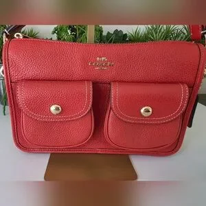 Authentic Coach Pennie Crossbody crafted in rich Mango Red pebbled leather with polished gold-tone hardware. This versatile crossbody features two front flap pockets and includes a matching detachable round coin purse, making it perfect for everyday use or travel.