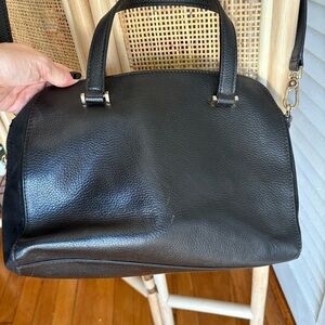 Timeless pebbled leather and suede satchel crossbody. In good used condition, some signs of wear on the suede sides and one or two minor spots on leather. All wear as seen in photos. Zipper top closure. Gold hardware.