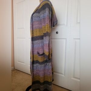 Pretty multicolor striped open cardigan in gray, pink, yellow and blue! Warm with hood and pockets. Perfect for layering.