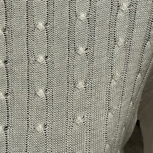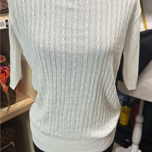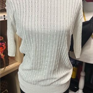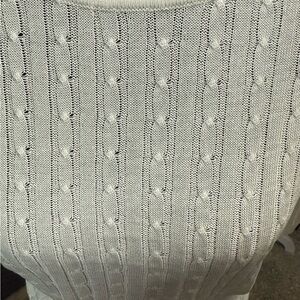Stay cozy and stylish with this elegant white cable knit sweater. Perfect for any occasion.