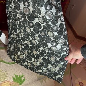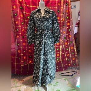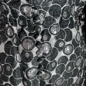 The metallic fabric catches the light beautifully, and the cut is phenomenal: tailored through the torso with fluid, wide-legs. Button-front closure with fabric-covered buttons (because of course).