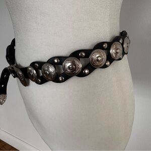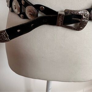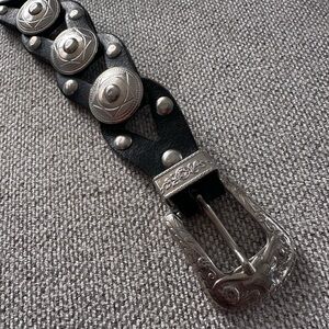 Striking black leather belt featuring a continuous row of silver-tone engraved conchos with stud detailing. This belt has a bold Western / Southwestern feel with a slightly rock & roll boho edge, perfect for styling with jeans, dresses, or layered over tunics and blazers.