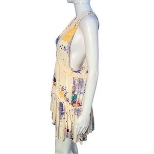 Free People flowy chiffon tunic pink/cream and purple haze floral print. Features wide shoulder straps with low cut armholes, V-neck, tiered silhouette with ruffled detailing & asymmetrical hemline.