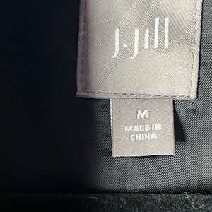 Chic J.Jill sleeveless blazer-style vest featuring a luxe black velvet front with a satin back panel and lining. Designed with an open front and single button closure for an elegant, minimalist look. Perfect for layering over blouses, dresses, or fitted tops for workwear or evening styling.
