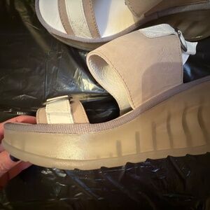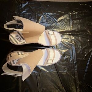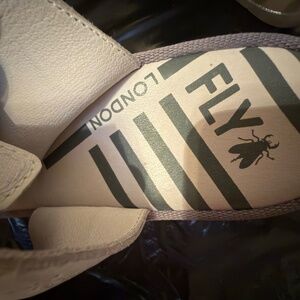 $240 FLY London platform wedge shoes size 40 white and taupe/tan