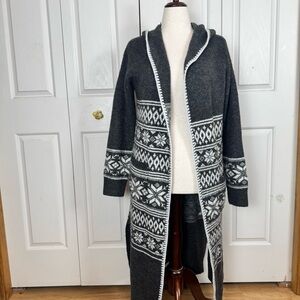 Cozy black and white hooded cardigan with intricate patterns. Perfect for layering.