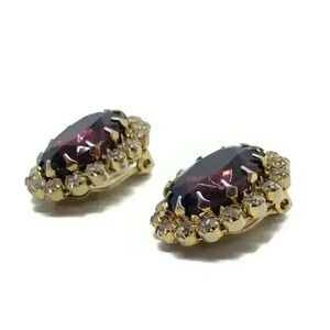 Vintage Earrings BIG PURPLE Faceted Rhinestone Clear Stones Prong Set Clips. Thesexare gorgeous. The deep purple stone is quite large and is surrounded by a row ofxsuper sparkly clear chaton stones. Set with large dog tooth prongs. Shipped with USPS First Class Package.