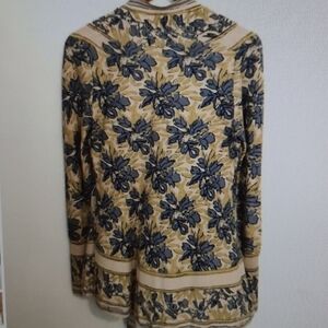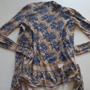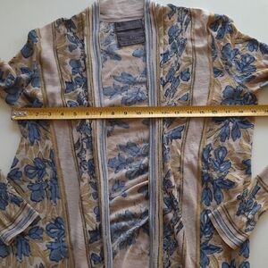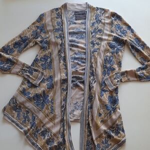 Anthropologie Guinevere open front waterfall cardigan beige blue floral extra small. Linen cotton blend. Waterfall front. Long sleeve. Fitted ribbed cuffs. Very goidpre-owned condition, has minimal pilling. Smoke free pet friendly home. Please see pictures for measurements. Blue brige open front cardigan Guinevere Anthropologie extra amall