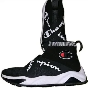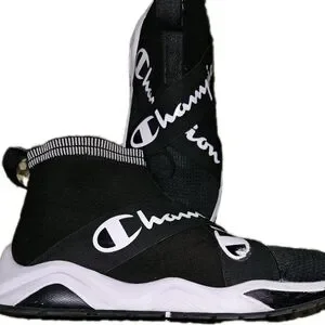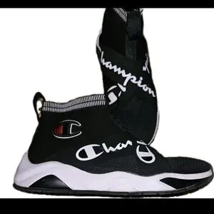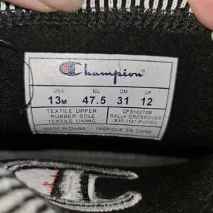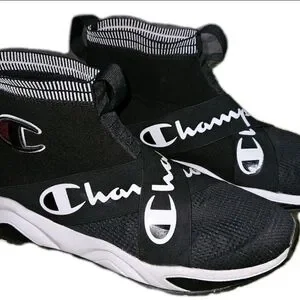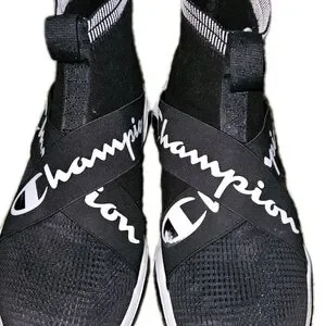 This is a pair of Champion Rally Crossover slip-on casual sneakers in black with a white sole. The shoes have a high-cut bootie construction with a breathable mesh upper and crossed midfoot straps featuring the Champion logo. Can see some of the white on the C coming off and some of the black was filled in with black permanent marker....not my doing. I'm sure there is a way to fix it, maybe 🤔 I'm not sure. Still excellent shape, lots of use and wear left in them. Plus, who's really going to be that up and close with them to really notice?