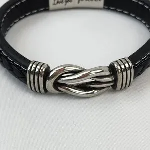 A perfect gift for the loved one on your life! It goes with everything so he can wear it all the time. The infinity knot design is said to represent eternal love or friendship. Made from braided leather with a stainless steel infinity knot