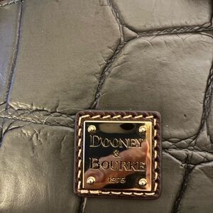 Stylish genuine Dooney croc-embossed design. Rich dark gray hue. Compact and versatile for daily use. Features gold-tone hardware. Has outside zipper compartment, 2 inside slot pockets and also has gold tone feet on the bottom for protection from floors, etc.