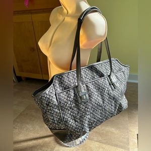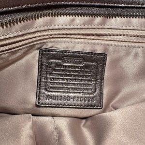 Clean tan satin interior features a large zipper pocket as well as two reach in pockets - one that is gusseted. Exterior reach in pockets on each side. Zippers work well. Silver tone Coach hardware on handles and exterior zipper pull are shown in pictures. Trimmed with gunmetal gray metallic leather. Hang tag is present. One small place on one of the handles shows wear; something sticky (not food - more like the edge of a page of address labels - shows up as a dashed white line in photos) may have adhered to the interior lining at some point. This is a pre-owned item in clean condition showing little overall wear.