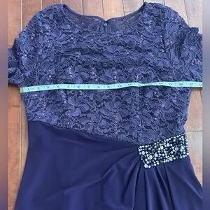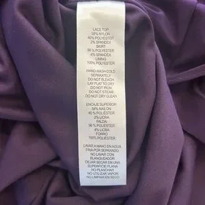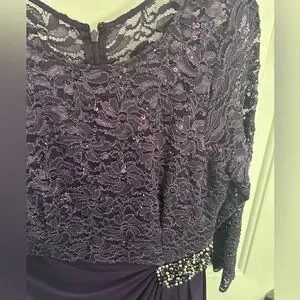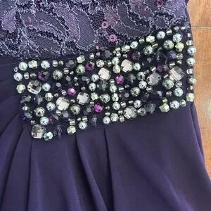 This elegant purple lace evening dress features a sophisticated design perfect for special occasions. The intricate lace detailing adds a touch of luxury, while the rich purple color ensures you stand out. Ideal for evening events or formal gatherings. Color is most close to the dress hanging picture. The true color was hard to capture with the phone camera. It’s a true deep elegant purple. Great condition! Fully lined. Zips up the back. I ship fast!