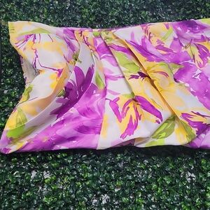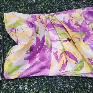 Chic strapless dress with vibrant floral design. Features bold purple and yellow colors. Perfect for special occasions.