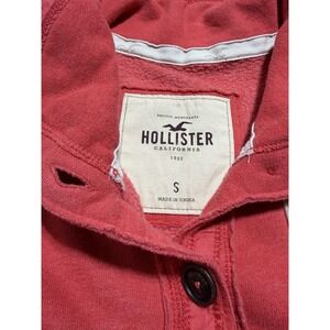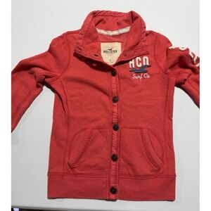 The Hollister Surf Watch 1922 Button Up Jacket in Blue is a stylish and vintage-inspired piece perfect for casual occasions. Made of a comfortable cotton blend with fleece lining, this bomber jacket features a stand-up collar and mid-length cut, making it ideal for the winter, fall, and spring seasons. The jacket also includes accents like buttons and the brand's logo, adding a touch of preppy flair to the overall Y2K-inspired design. With a classic solid pattern and regular fit, this jacket is a versatile addition to any man's wardrobe. Color is a coral/light red.