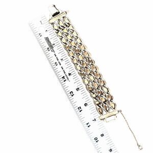 Striking vintage wide panel bracelet featuring an articulated multi-row design with alternating textured and smooth oval links. Substantial in weight with excellent vintage craftsmanship, finished with a secure box clasp and safety chain.
