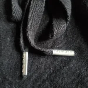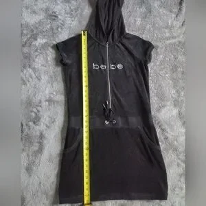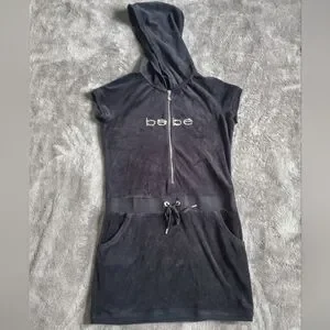 Stylish black hooded dress with front pockets and drawstring waist. Features Bebe logo on the front.