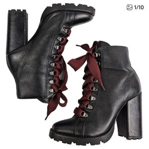This is a Schutz Zhara (or Zara) high block-heel combat bootie in black leather with bold red laces. Stylish black boots a showstopper. Comfy and Perfect for a standout look.