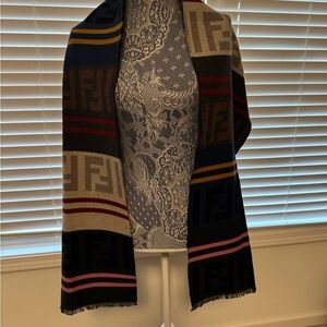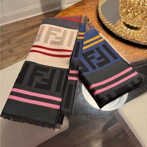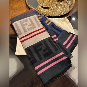 Luxurious Fendi scarf Featuring the iconic logo design. The scarf is double sided and measures over 60 inches in length and when opened all the way up it’s 14.5 in width. Comes with dust bag. Excellent condition! In my opinion this can be unisex.