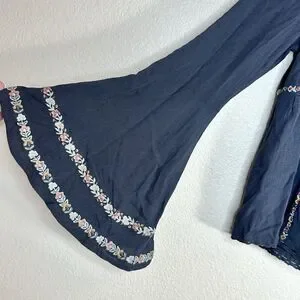 American Eagle XS Navy Embroidered Peasant Top Boho Bell Floral Bell Sleeve
