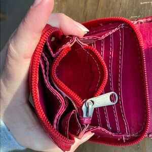 Very spacious beautifully tooled red leather wallet made in Paraguay. Ample cards slots and zippered compartment. Tear to ID compartment as pictured. Damage to interior leather as pictured. Offers welcome.