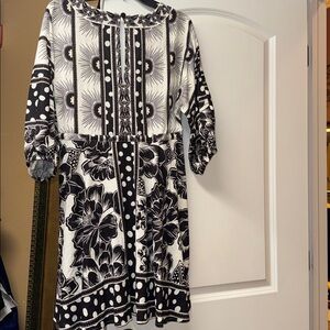 Stylish black and white floral dress with a deep V-neck and tie waist. Features a mix of patterns for a unique look. Perfect for any occasion. No tags. Never worn.