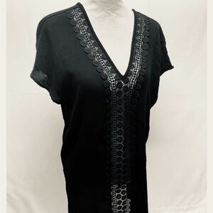 Stylish black cover-up with intricate lace detail. Perfect for beach or poolside elegance.