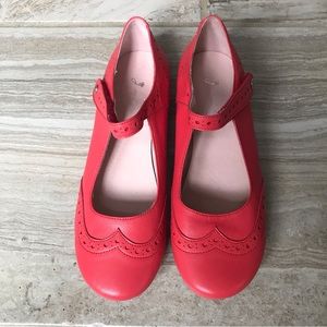 Charming red kids shoes by Jacadi. Features a classic Mary Jane style with a secure strap. Perfect for any occasion.
