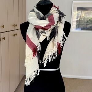 Authentic Burberry shawl/scarf is amazing perfect all year round! Extra-fine merino wool lends unmistakable style to a lush scarf that's both lightweight and cozy. In excellent preloved condition, minor snags shown in photos. Originally $595.