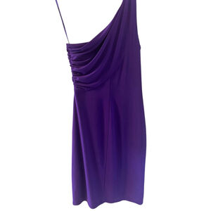 Lauren Ralph Lauren dress in size 4. The dress is a vibrant purple color and features a one-shoulder design with ruched fabric detailing on the bodice. It is made of 95% polyester and 5% elastane. The dress has a fitted silhouette and falls to approximately knee length. There are no visible stains, tears, or other significant imperfections. #LaurenRalphLauren #PurpleDress #OneShoulderDress