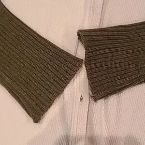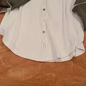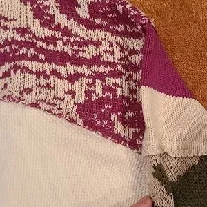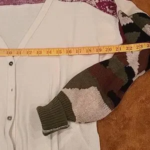 Trendy cardigan featuring a white/cream body with stylish camouflage sleeves and purple accents. Perfect for a fashionable look.