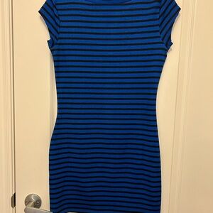 Stylish blue and black striped dress perfect for any occasion. Comfortable and chic, this dress is a must-have for your wardrobe.