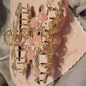 Chic hair clips by Capelli of New York. Gold finish with pink floral details. Perfect for adding elegance.