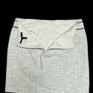 NWT Chic mini skirt with a textured cream fabric. Features stylish black trim accents. Perfect for versatile styling.