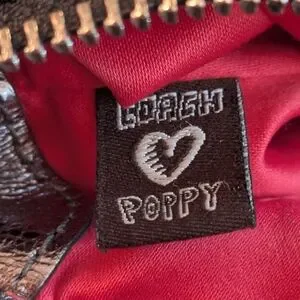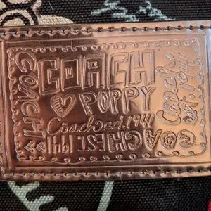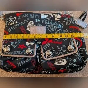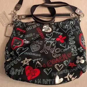 Black and red Coach x Poppy handbag with red interior and two pockets on the front. short and long strap included, as well as three coach keychains attached to the bag. Good condition, rare.