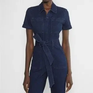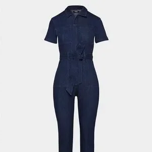 This is a slim-fit denim jumpsuit with front patch pockets, a removable self-tie belt, and a straight-leg silhouette for a clean, flattering look.