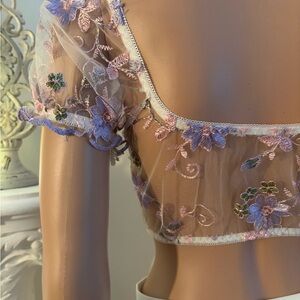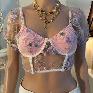 Chic sheer bralette with floral embroidery. Soft pink hue. Ideal for a stylish intimate look.