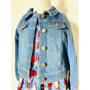 Adorable apple print knit dress with stretch knit “jean” jacket. Dress is 95% cotton, 5% spandex. Jacket is 79% cotton, 15% polyester and 6% spandex. New with tags.