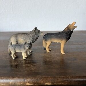 Male wolf howling, female wolf and wolf pup family set. Lot of 3.