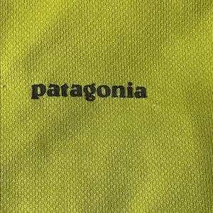 Vibrant green Patagonia shirt. Reflective logos on front and back of shirt. Short sleeves, crew neck. Ideal for outdoor activities.