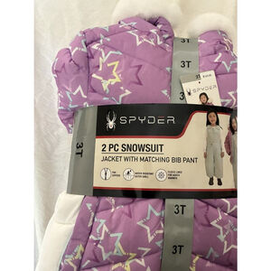 SPYDER SIZE 3T The new 2 PC Spyder snowsuit jacket with matching bib pant in Size 3T, is perfect Retail Value $165.00 for girls who love skiing. Or Snow Made with durable polyester outer shell material and lined with 100% polyester, this colorful snowsuit set provides both warmth and style on the slopes. The blended fabric design ensures easy movement and comfort during outdoor activities, making it a must-have for any winter adventure. Ideal for keeping little ones cozy and stylish in cold weather. Lightweight