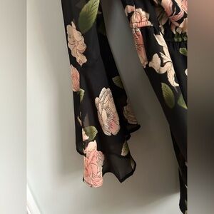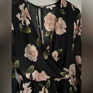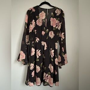 Charlotte Russe bell-sleeve black dress with soft pink/peach/cream floral print. Features a flattering (lined) wrap style neckline, elastic waistband, semi-sheer back with keyhole button closure. Lined skirt under semi-sheer outer dress.