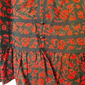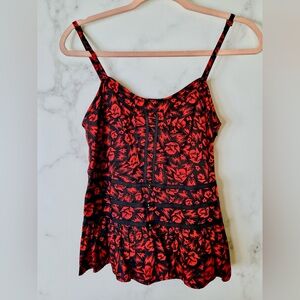 Stylish floral top with adjustable straps. Features a vibrant red and black pattern, a peplum bottom, and adorable buttons. This top is perfection.