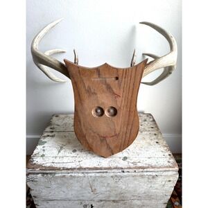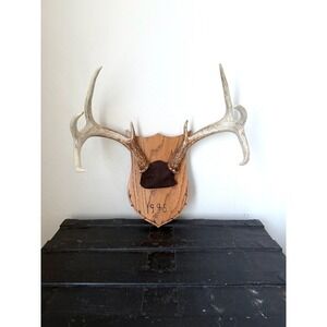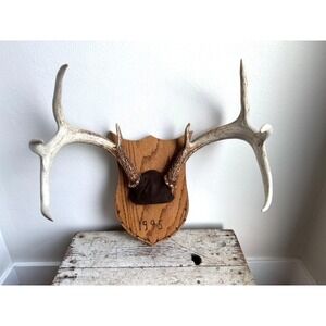 8-point whitetail deer antler rack mounted on a solid oak plaque. Rustic natural finish with a 20" width span. Ideal for lodge, cabin, or man cave wall decor. Michigan harvest dated 1995.