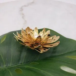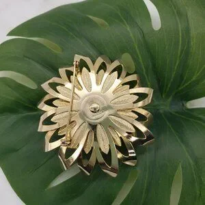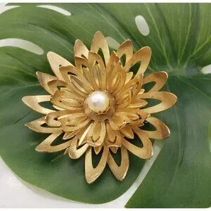 Its exquisite flower design features an intricate "blooming petals" tiered layered structure, highlighted by a luminous faux pearl at the center. The outer layer of the petals are textured gold, and the inner layer is shiny gold. Really gives an illusion of a flower in bloom. Dahlia, zinnia, aster, mum